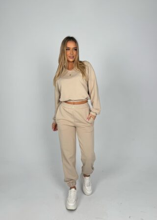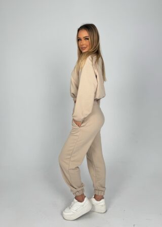 Beżowy dres damski Eclipse to minimalistyczny, a zarazem kobiecy zestaw, który doskonale sprawdzi się zarówno w domowych stylizacjach, jak i podczas wyjść do miasta. Bluza z dekoltem w kształcie litery V ma luźny, modny fason, a spodnie typu jogger z elastyczną talią i ściągaczami zapewniają wygodę oraz świetne dopasowanie. Całość uszyta została z wysokiej jakości, naturalnej bawełny, dzięki czemu dres jest miękki, przewiewny i komfortowy w noszeniu. Złote detale RB subtelnie podkreślają luksusowy charakter zestawu.