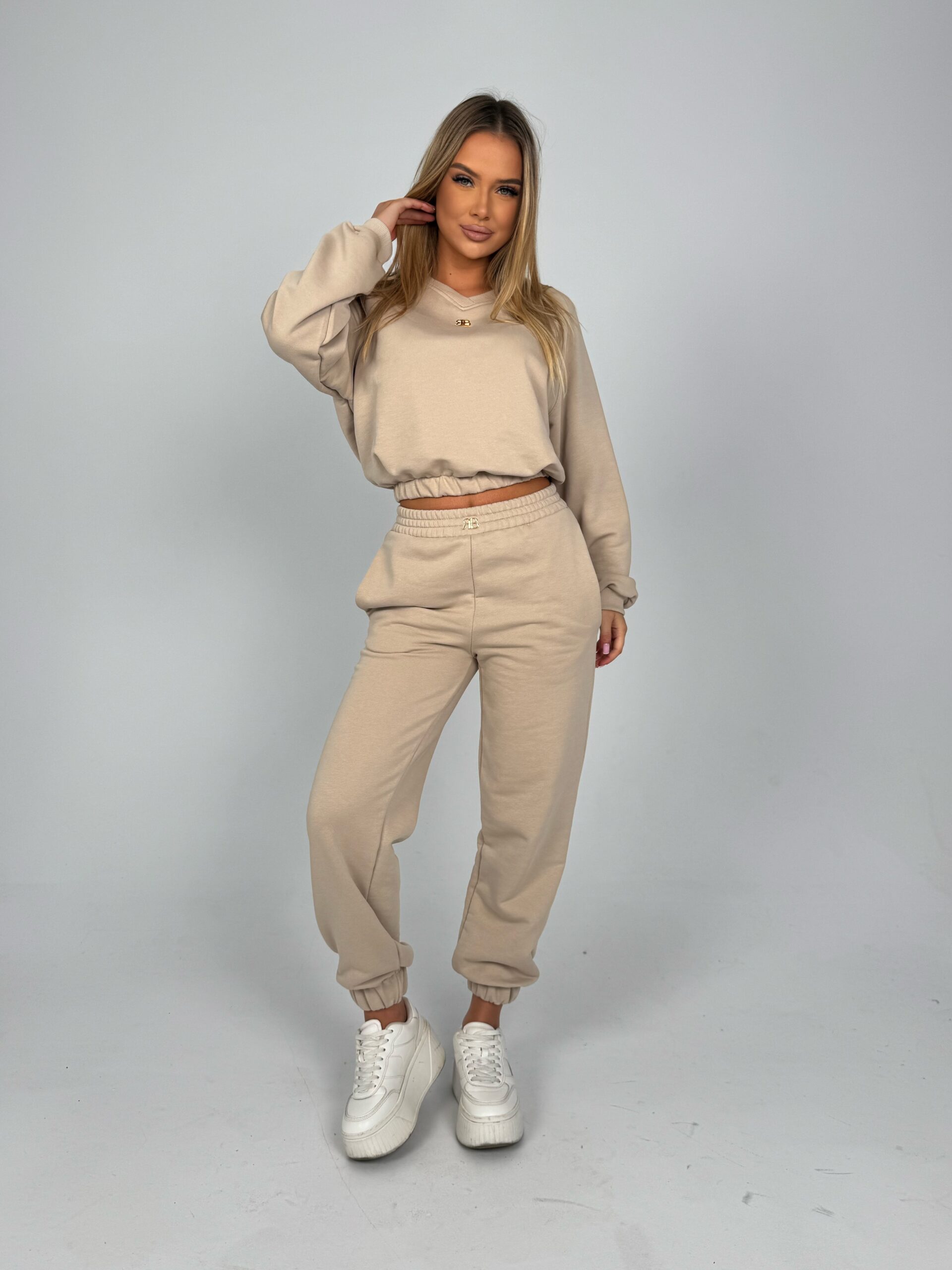 Beżowy dres damski Eclipse to minimalistyczny, a zarazem kobiecy zestaw, który doskonale sprawdzi się zarówno w domowych stylizacjach, jak i podczas wyjść do miasta. Bluza z dekoltem w kształcie litery V ma luźny, modny fason, a spodnie typu jogger z elastyczną talią i ściągaczami zapewniają wygodę oraz świetne dopasowanie. Całość uszyta została z wysokiej jakości, naturalnej bawełny, dzięki czemu dres jest miękki, przewiewny i komfortowy w noszeniu. Złote detale RB subtelnie podkreślają luksusowy charakter zestawu.