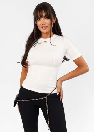 Biały t-shirt damski Mono to propozycja dla kobiet, które cenią subtelną elegancję i wysoką jakość. Wykonany z miękkiej wiskozy z dodatkiem nylonu i elastanu, pięknie układa się na sylwetce, podkreślając kobiece kształty. Delikatne pionowe przeszycia modelujące oraz logo RB w kolorze złota przy dekolcie dodają mu luksusowego charakteru. Idealny zarówno do dżinsów, jak i spódnicy czy marynarki.
