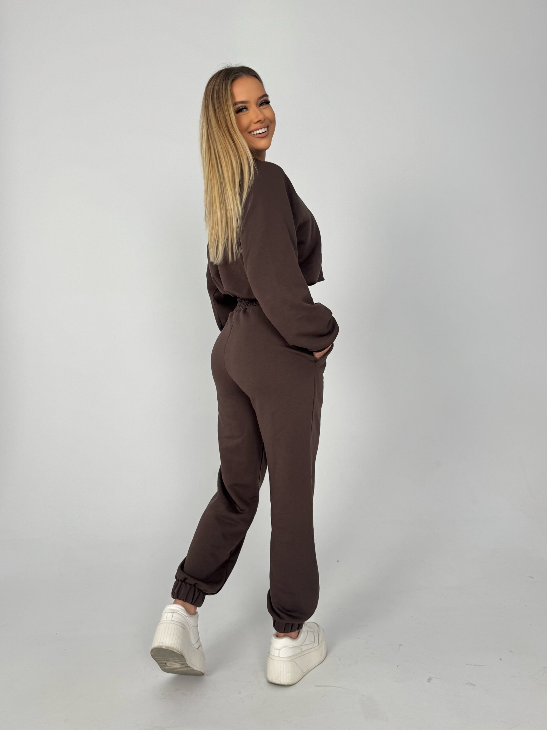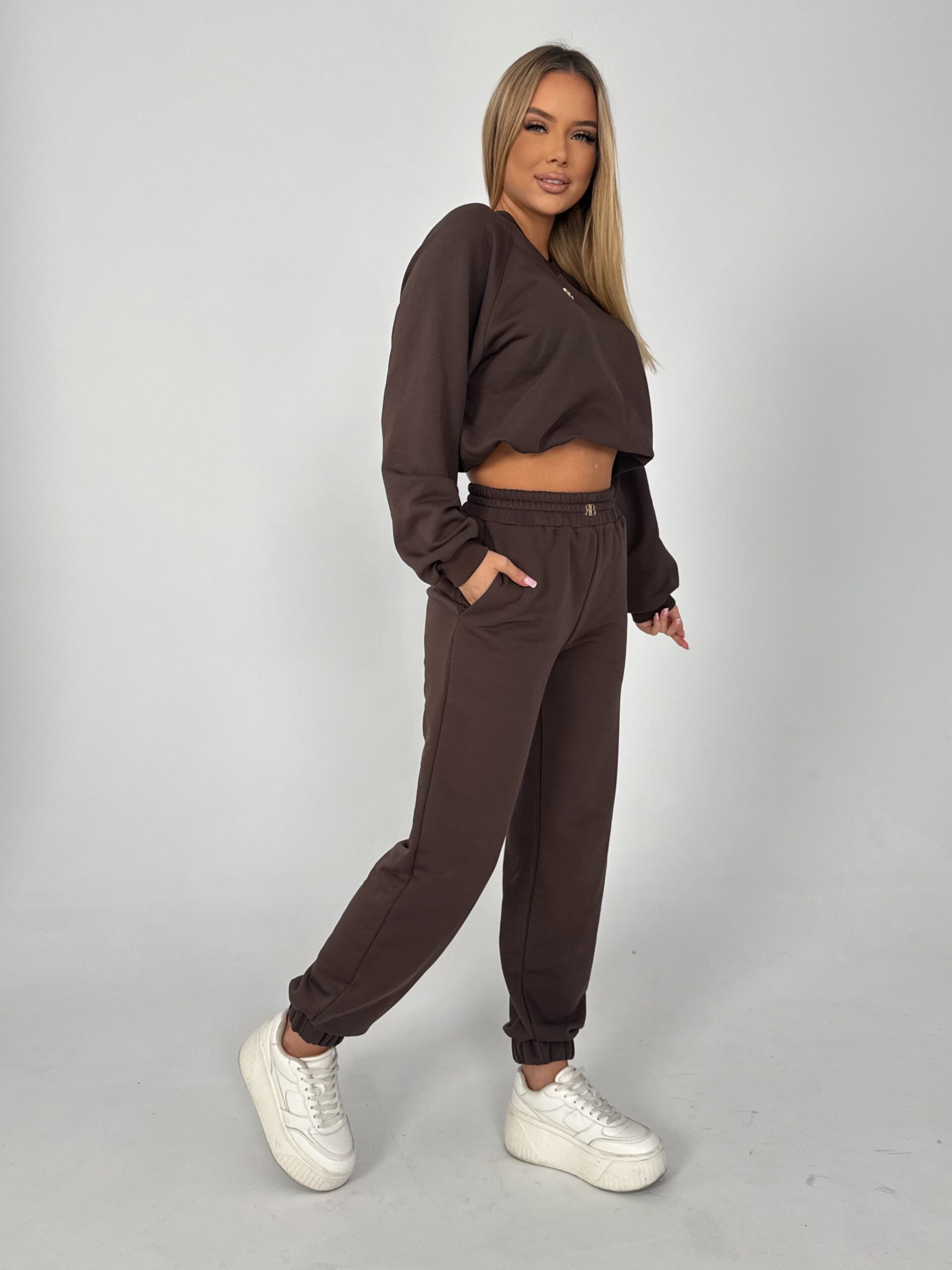 Brązowy dres damski Eclipse to minimalistyczny, a zarazem kobiecy zestaw, który doskonale sprawdzi się zarówno w domowych stylizacjach, jak i podczas wyjść do miasta. Bluza z dekoltem w kształcie litery V ma luźny, modny fason, a spodnie typu jogger z elastyczną talią i ściągaczami zapewniają wygodę oraz świetne dopasowanie. Całość uszyta została z wysokiej jakości, naturalnej bawełny, dzięki czemu dres jest miękki, przewiewny i komfortowy w noszeniu. Złote detale RB subtelnie podkreślają luksusowy charakter zestawu.