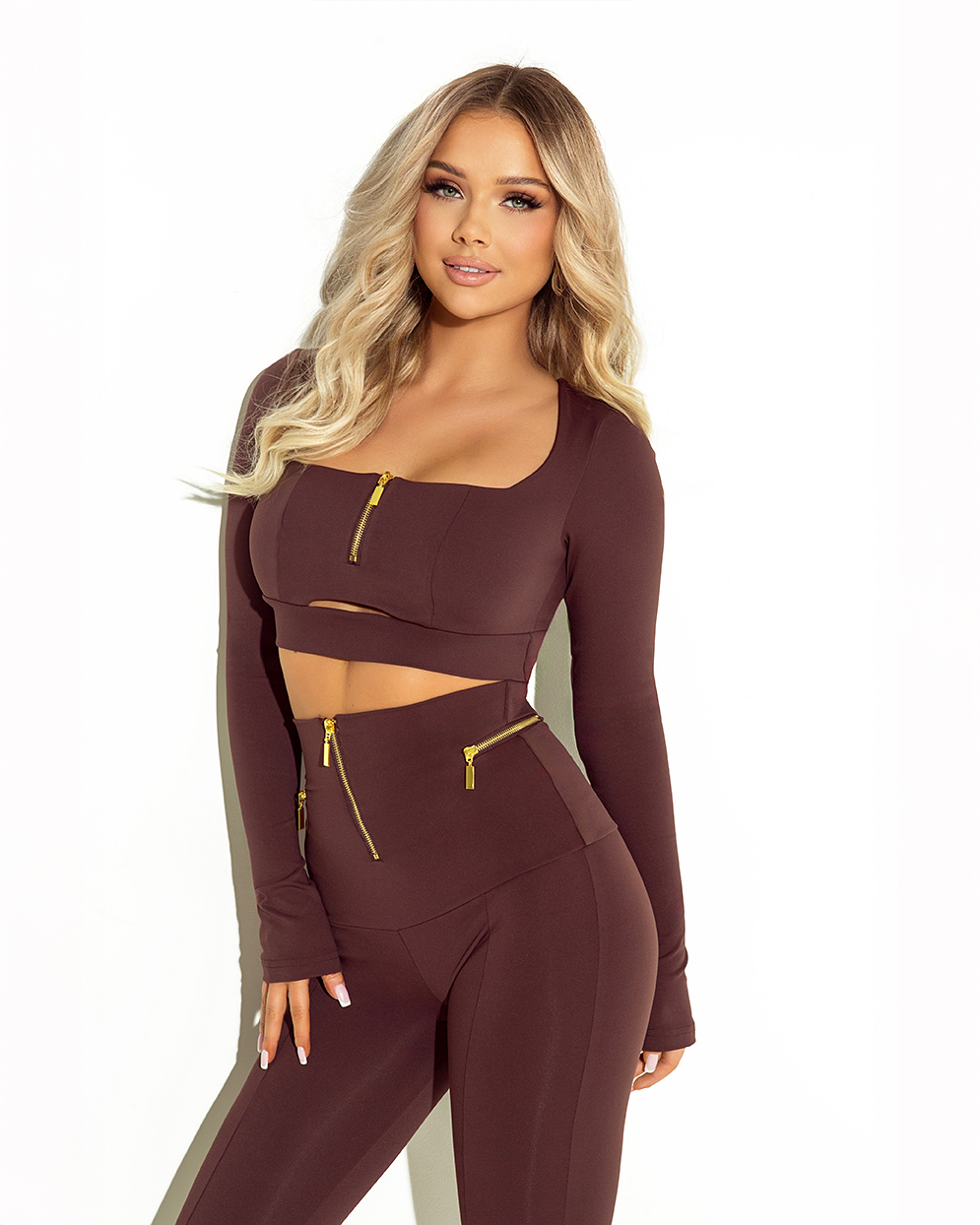 Brązowy komplet AXE składa się z krótkiego topu z długim rękawem oraz spodni z wysokim stanem. Top o dopasowanym fasonie subtelnie podkreśla biust, a ozdobny, złoty zamek na środku nadaje całości wyrazistego charakteru. Długie rękawy wysmuklają ramiona i idealnie balansują krótki krój góry.